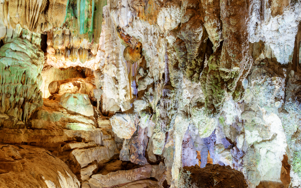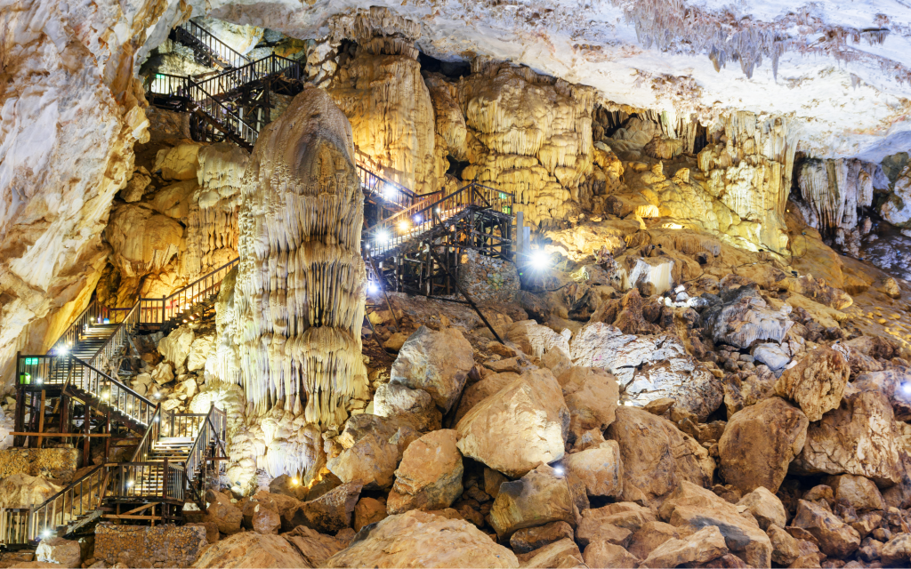 09:30: AMParadise Cave Exploration: Visitors begin their journey with a 1.6 km tram ride, followed by a short hike to the narrow entrance of Paradise Cave. Once inside, the cave reveals a vast, cool space with ceilings up to 60 meters high and widths of 120 meters. Wooden stairs guide you through this “Underground Royal Palace,” showcasing magnificent stalactites and stalagmites illuminated by soft LED lights. The cave’s natural wonders, including formations resembling flowers, trees, and waterfalls, leave visitors in awe. After two hours of exploration, the tour concludes with a return to the parking lot, leaving unforgettable memories.